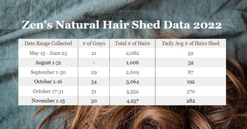 Also, the actual numbers are more than this; I can't literally collect them all. I have a routine, but it's not a perfect system by any means and I don't know anyone else who has attempted to collect and count their sheds in any matter, so take it for what it's worth. The best numbers for comparison in the chart below are the daily averages, which indicate my shedding is slowly backing off. Hopefully, that's the case. I keep joking that if I go bald, I haven't really lost my hair because I know exactly where is it.